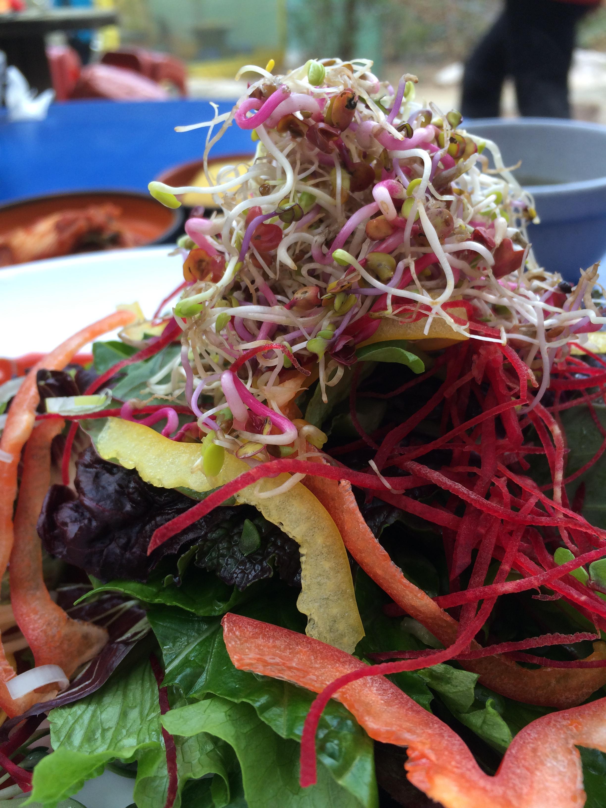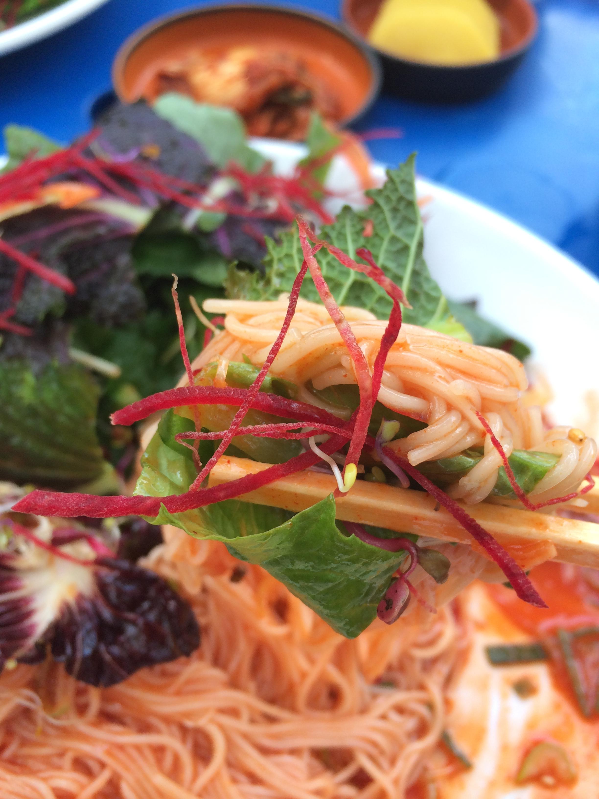 그런데 비빔양념의 맛이 좋다. 야채들을 여러가지 같이 먹어도 좋다. 국물도 매운 맛을 달래준다. 어찌보면 너무나도 당연한 이야기인데 그 기본에 충실한 건강한 비빔국수집이다.