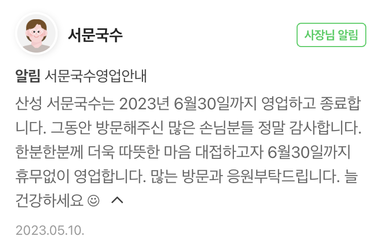 ---> 서문국수 금정산 본점이 2023년 6월 30일까지만 영업하고 문을 닫는다고 한다.